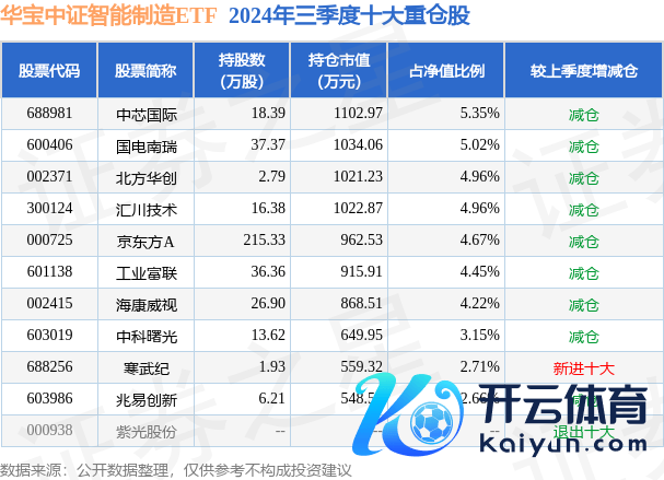 华宝中证智能制造ETF为指数型-股票基金,凭据最新一期基金季报走漏,该基金钞票设立:股票占净值比98.63%,无债券类钞票,现款占净值比1.49%。基金十大重仓股如下: