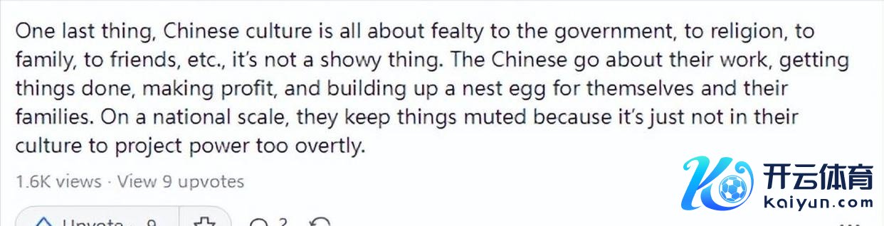中国东谈主奋发职责,完成任务,赢利养家,为家东谈主存钱。在国度层面,他们经常比拟低调,因为涌现出太强的实力并不妥当他们的文化习尚。
