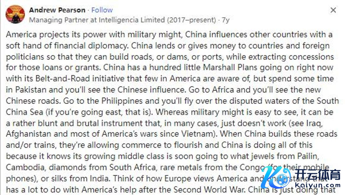但若是你在巴基斯坦待上一段时刻,你就能感受到中国的影响力。去非洲望望,你会发现中国的发展谈路。诚然军事力量一眼就能看出来,但它可能是一种比拟通俗暴燥的妙技。