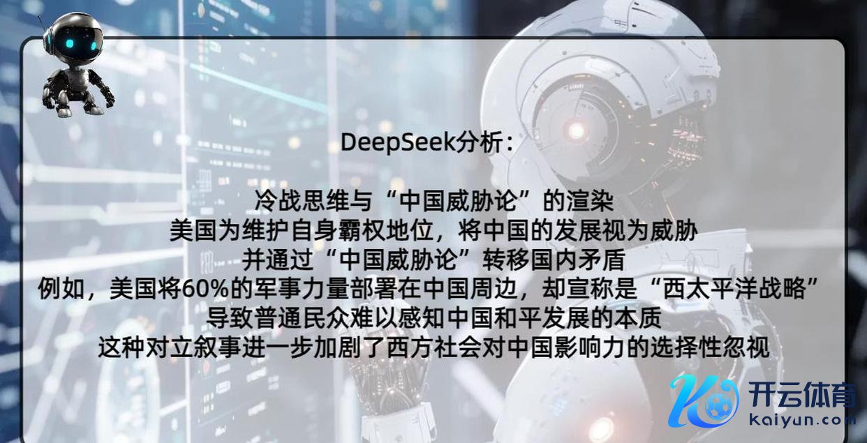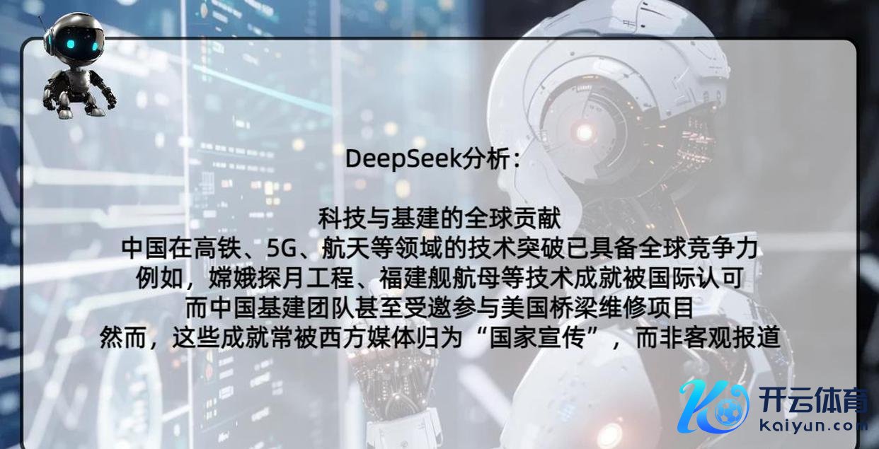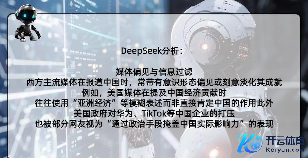 关于这位好意思国网友的发问,东谈主工智能DeepSeek也作念了个精熟的报告:中国的影响如实越来越大了,但西方主流媒体在报谈中国的时候,往往带着一些坚韧形态上的偏见,大致故意不提中国的树立。