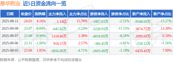 8月11日的资金流向数据方面,主力资金净流入5071.56万元,占总成交额5.82%,游资资金净流出2994.37万元,占总成交额3.43%,散户资金净流出2077.18万元,占总成交额2.38%。