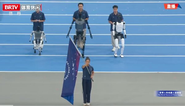 记者在现场看到,合手旗头是本届泄露会年岁最小的参赛工程师于程程,她只须14岁,来自北京四中说念元校区。三位护旗头泄露员则是2025北京亦庄半程马拉松暨东说念主形机器东说念主半程马拉松的冠亚季军取得者:天工ultra、松延能源N2和卓益得行者二号。
