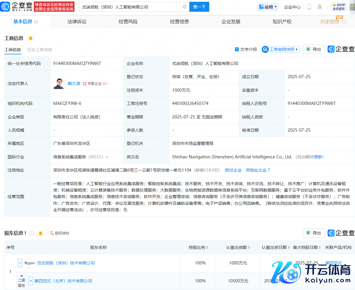 企查查APP线路,近日,式说领航(深圳)东谈主工智能有限公司竖立,法定代表东谈主为戴文渊,注册成本为1000万元,谋略限度包含:东谈主工智能行业行使系统集成事业;智能抛弃系统集成;云盘算装备技艺事业;数据贬责事业;大数据事业等。企查查股权穿透线路,该公司由第四范式(北京)技艺有限公司盘曲全资抓股。 【免责声明】本文仅代表作家本东谈主不雅点九游体育app官网,与和讯网无关。和讯网站对文中讲演、不雅点判断保抓中立,不合所包含骨子的准确性、可靠性或完好性提供任何昭示或示意的保证。请读者仅作参考,并请
